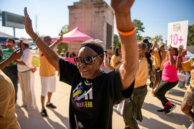 Portia Lawson celebrates being 23 days cancer free during 2025 Sistah Strut outside of Birmingham’s Legion Field Stadium. (Amarr Croskey / The Birmingham Times)