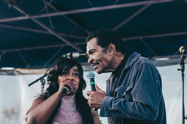 Singer Mizz Lowe and her mentor, Blues Hall of Famer and Grammy winner Bobby Rush during a set at the Safe Summer Series in historic Rickwood Field. (Marika N. Johnson / The Birmingham Times)