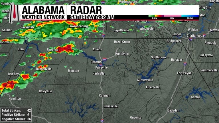 Overnight and into the early morning hours, attention shifted to storms developing along a cold front. Scattered thunderstorms flared across northeast Alabama near Fort Payne and Centre, producing gusty winds, frequent lightning, and pockets of heavy rain.