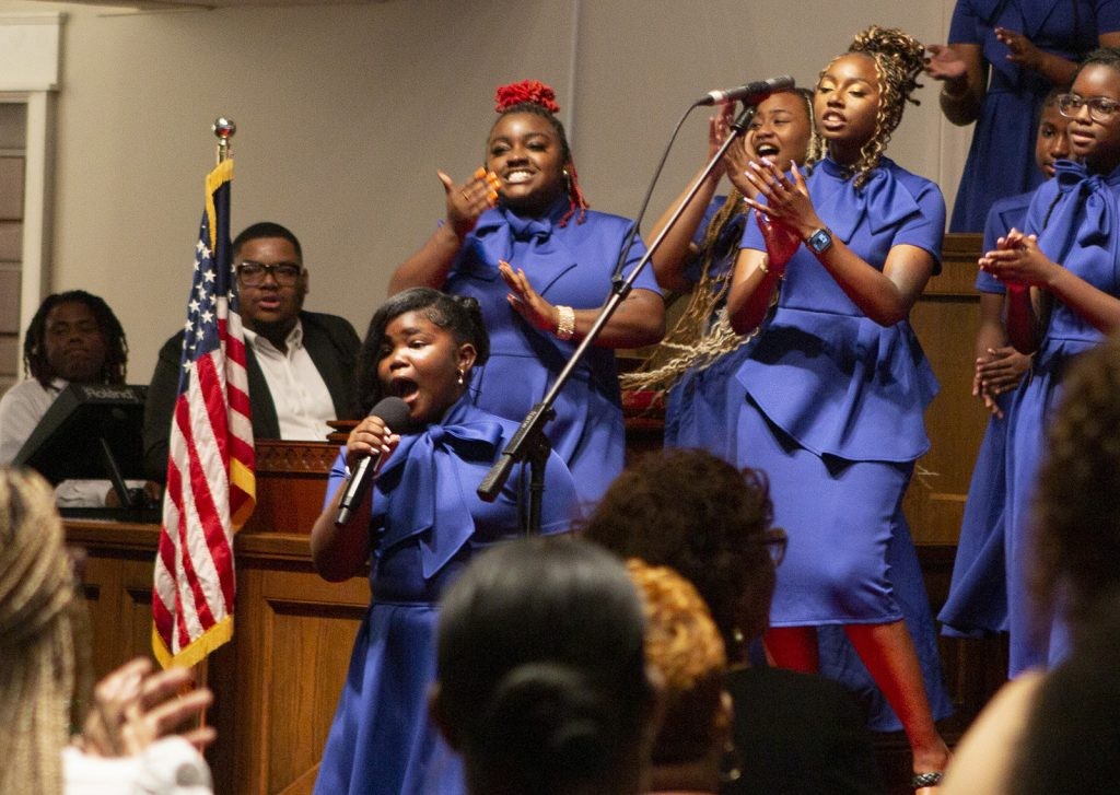 Sommitt Carter leads a solo for the Birmingham Youth & Young Adult Fellowship Choir at 16th Street Baptist Church. (Marika N. Johnson / Birmingham Times)
