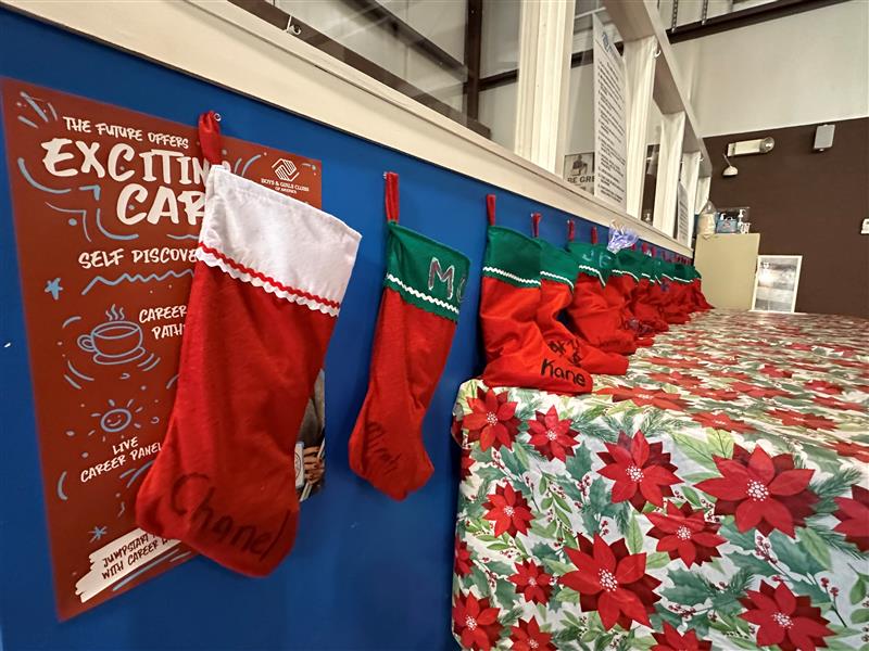 Stockings with the names of local youth hang inside the Charles A. Hamilton Teen Center. (Joey Blackwell / Alabama News Center)