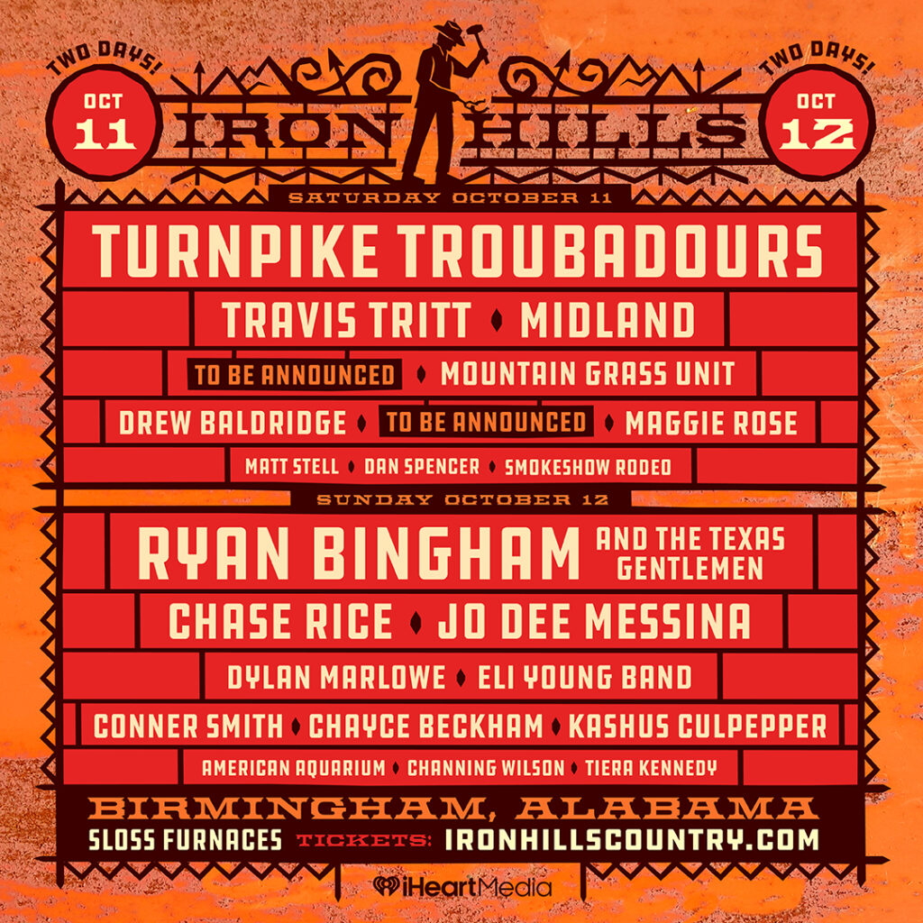 Save the date for the inaugural Iron Hills Country Music Festival Oct. 11-12, at the Sloss Furnaces National Historic Landmark. Rising country stars and modern chart toppers will intersect with legacy country artists on two stages for an unforgettable weekend of country music and more. The complete music lineup is here. Purchase your ticket at ironhillscountry.com.