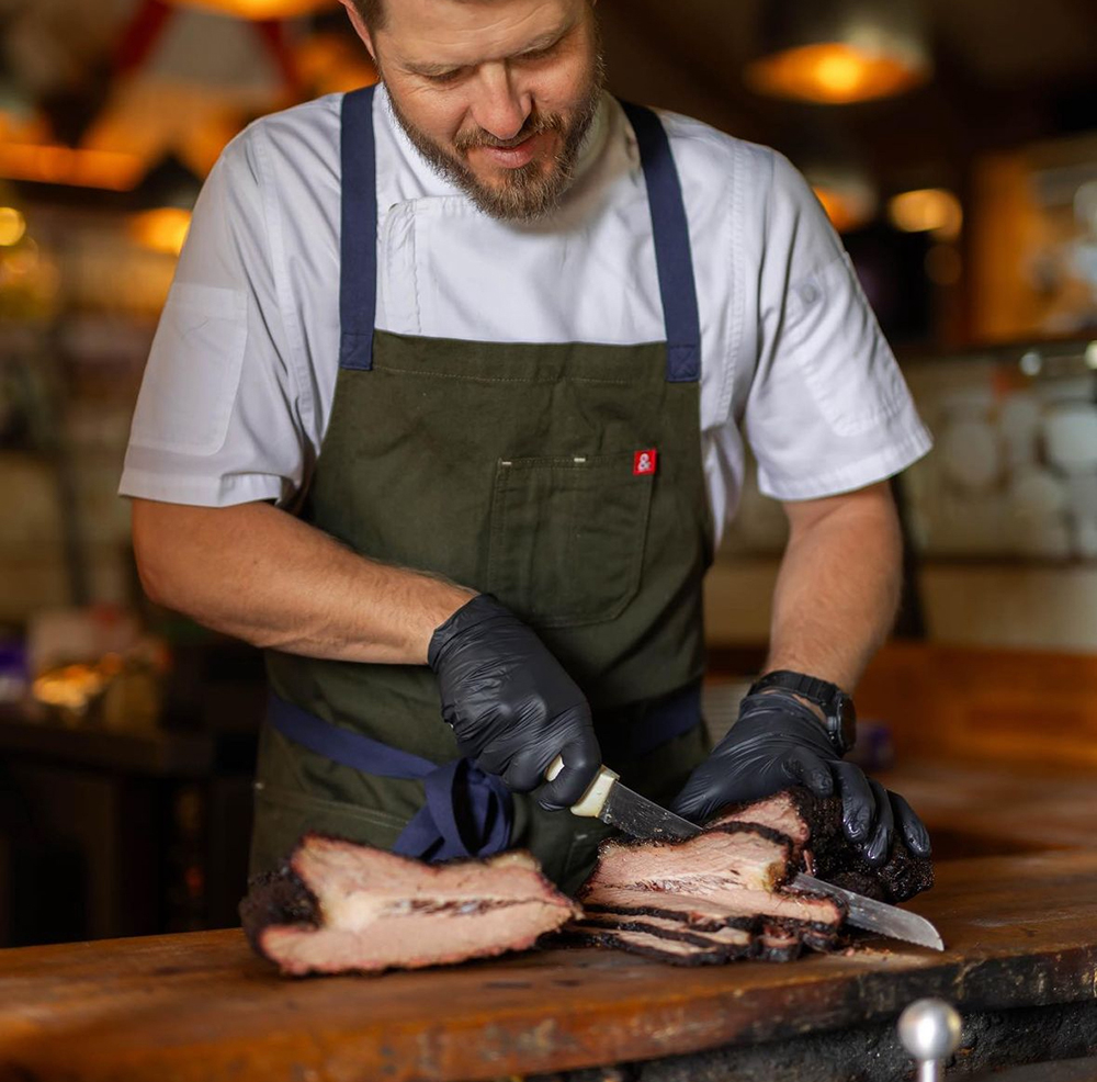 Chef David Bancroft slices a brisket at Bow & Arrow. Bancroft’s Texas roots are evident on the restaurant’s menu. (Craig Godwin / Visit Auburn/Opelika)