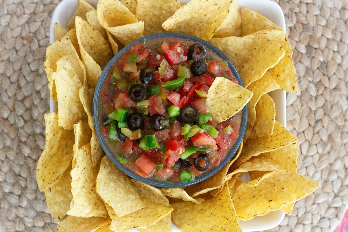 Mix all ingredients together and chill. Serve with chips. Cook’s note: If you use fresh tomatoes, use about 3 Roma tomatoes because they have less juice.