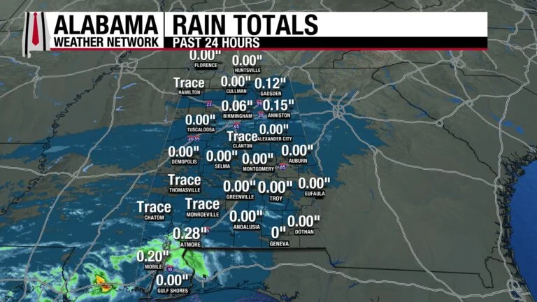 Clouds will blanket the state throughout the day, and the southern showers will drift northward through the morning. A slight chance of rain lingers in North Alabama, though any rainfall will be minimal. Despite the clouds, highs will be in the upper 50s north, low to mid 60s in central Alabama, and upper 60s-low 70s south.