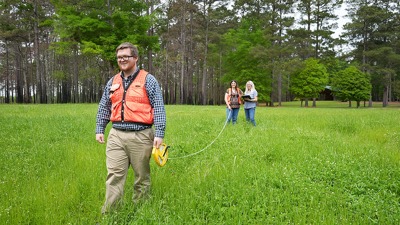 Logan Schatz, left, Jessica Baldwin, center, and Professor Lori Eckhardt measure the area for a sentinel garden at the Mary Olive Thomas Demonstration Forest. (contributed)