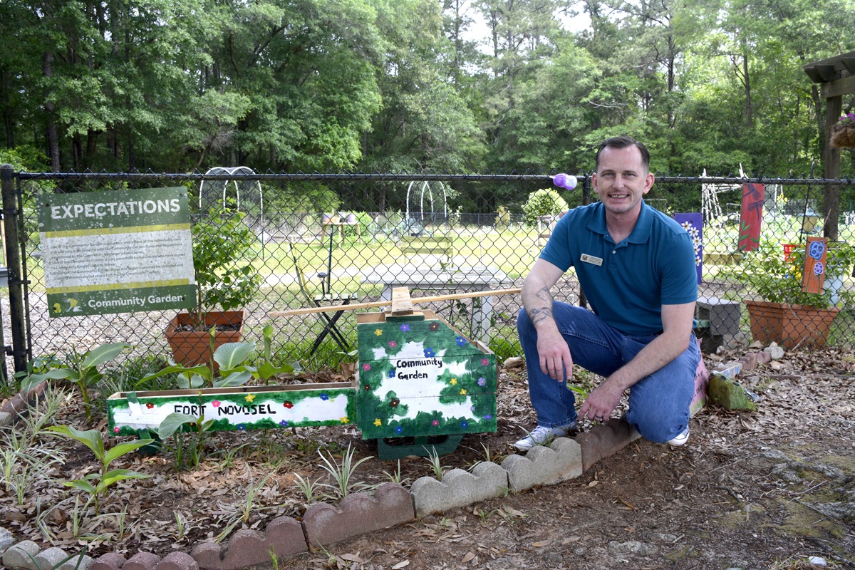 Staff Sgt. Morgan Stoll built planters, such as the one shown, for the Fort Novosel Community Garden. Stoll’s woodworking skills provide a well-received improvement to the garden. (John Hamilton / Fort Novosel Public Affairs)