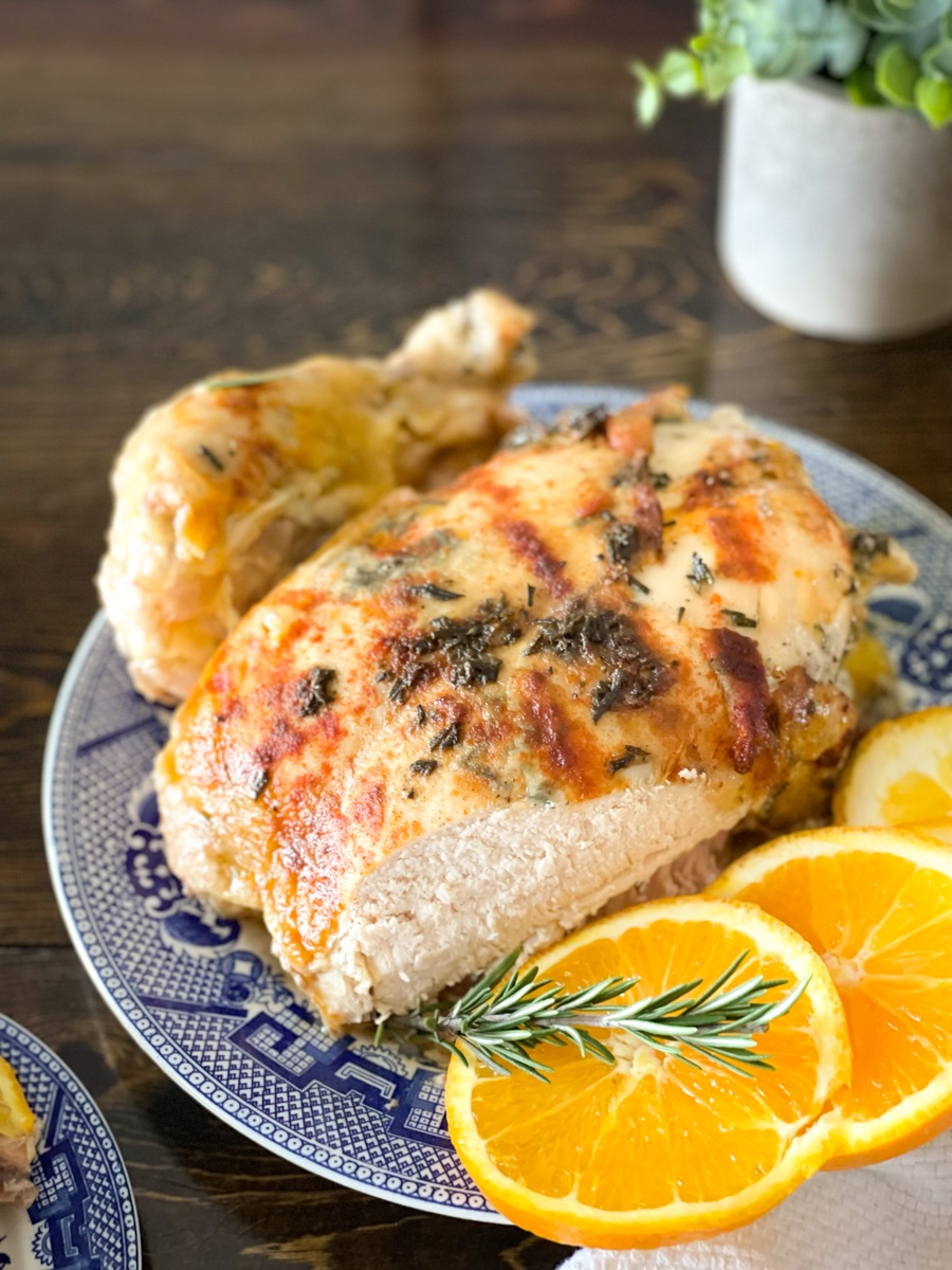 Salt and pepper chicken. Place the whole head of garlic, rosemary sprigs and one orange in cavity of chicken. Loosen skin of chicken and put half of butter mixture under skin. Rub remaining on outside of chicken.