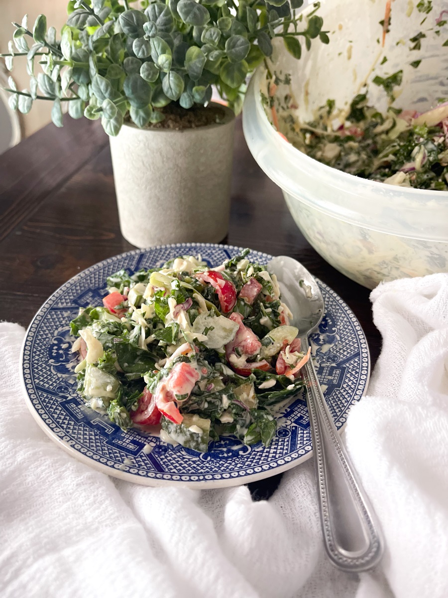 Dice the tomatoes into bite-sized pieces. Smash cucumbers with the side of your knife and chop the same size as the tomatoes. Add to the kale and romaine mixture in the bowl.