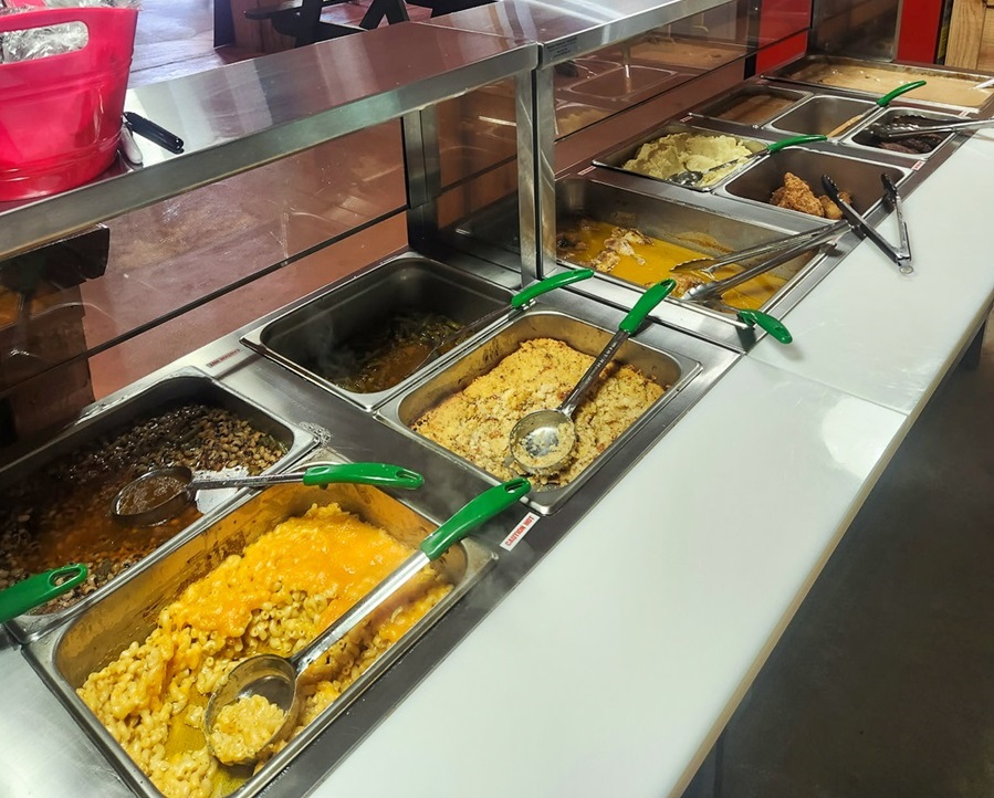 A hot bar warms things up, with rotating offerings like field peas, fried chicken, mashed potatoes, collard greens and sauteed squash ready to fill plates and then bellies. Daily specials often include barbecue nachos with fresh-made pico de gallo, taco salads (which always sell out), fried catfish on Fridays and whole slabs of ribs on Saturdays.