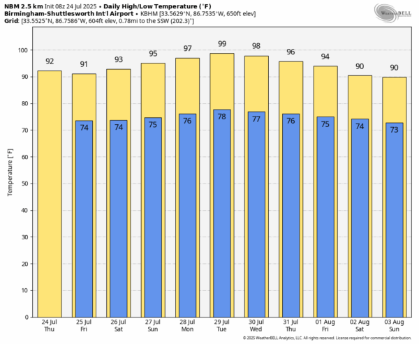 SUMMER DAYS: Classic summer weather continues across Alabama and the Deep South through the weekend. That means partly sunny, hot, humid days with the risk of a passing afternoon or evening shower or thunderstorm in scattered spots. Afternoon highs will be mostly in the low 90s through Saturday, followed by mid 90s Sunday. The chance of any given location seeing a shower is 30-40% today and Friday, dropping to 20-30% by the weekend. Most of the scattered storms will come from about 1 until 10 p.m.