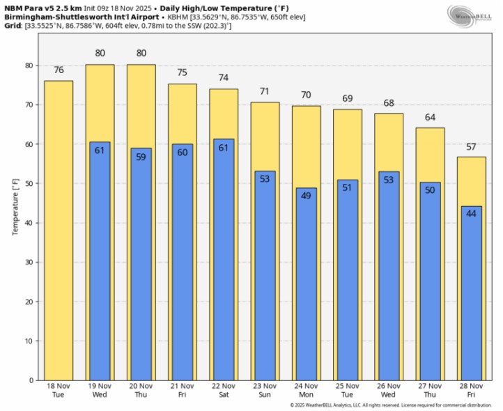 WARM AFTERNOONS: Alabama’s weather will remain mostly dry through mid-week with temperatures above average for mid- to late-November. After a high in the 74–80-degree range today, most of the state will see a high in the low 80s tomorrow and Thursday. A number of new daily record highs will likely be established thanks to an upper ridge over the region nosing in here from the Gulf. A few isolated showers are possible tomorrow, but most communities will stay dry.
