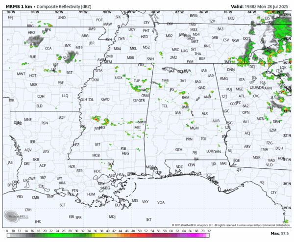 RADAR CHECK: Widely scattered showers and thunderstorms are in progress across Alabama this afternoon; otherwise, we have a partly to mostly sunny sky with temperatures generally in the mid 90s. Showers will end quickly after sunset; tonight will be mostly fair with a low in the 70s.