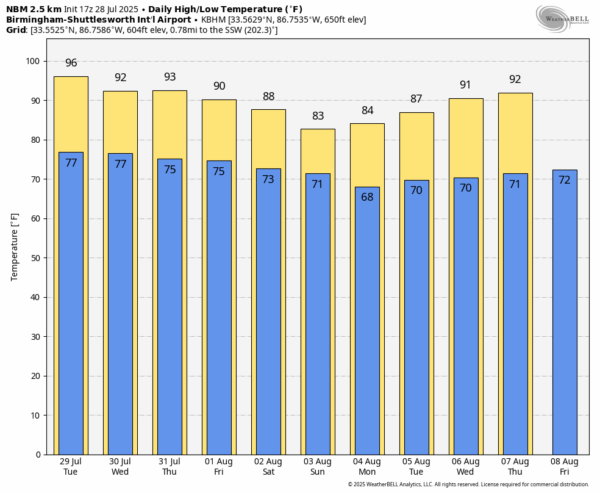 THE ALABAMA WEEKEND: Global models suggest temperatures will be well below average — highs in the mid 80s Saturday and potentially in the low 80s Sunday. Some record-low maximum temperatures are possible Sunday. The sky will be occasionally cloudy both days with scattered to numerous showers and thunderstorms. It won’t be a washout, but expect some rain from time to time both days, with higher coverage during the afternoons and evenings.