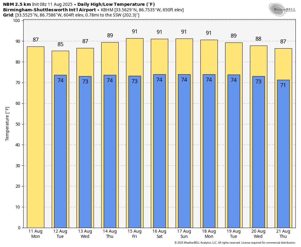 THE WEEKEND: We expect routine summer weather for Alabama and the Deep South over the weekend … partly sunny days with the usual daily rounds of “scattered, mostly afternoon and evening showers and thunderstorms”. Highs will be in the low 90s, right at seasonal averages for August.