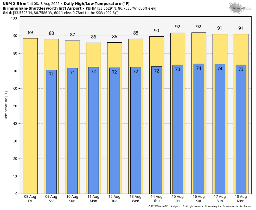 NEXT WEEK: Warm, humid weather continues through the week with the daily round of scattered showers and storms, most active during the afternoon and evening hours. The chance of any one community seeing rain each day is in the 50-60% range, and highs will be in the 86-92 degree range for much of the week.