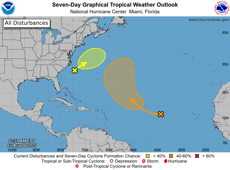 TROPICS: A non-tropical area of low pressure is expected to form in a day or so a few hundred miles offshore of North Carolina. Some tropical or subtropical development is possible this weekend while the system moves northeastward over the warm waters of the Gulf Stream. By early next week, the low is expected to reach colder water and an area of strong upper-level winds, ending its chances for tropical or subtropical development. Chance of development is only 20%, and this is no threat to land.