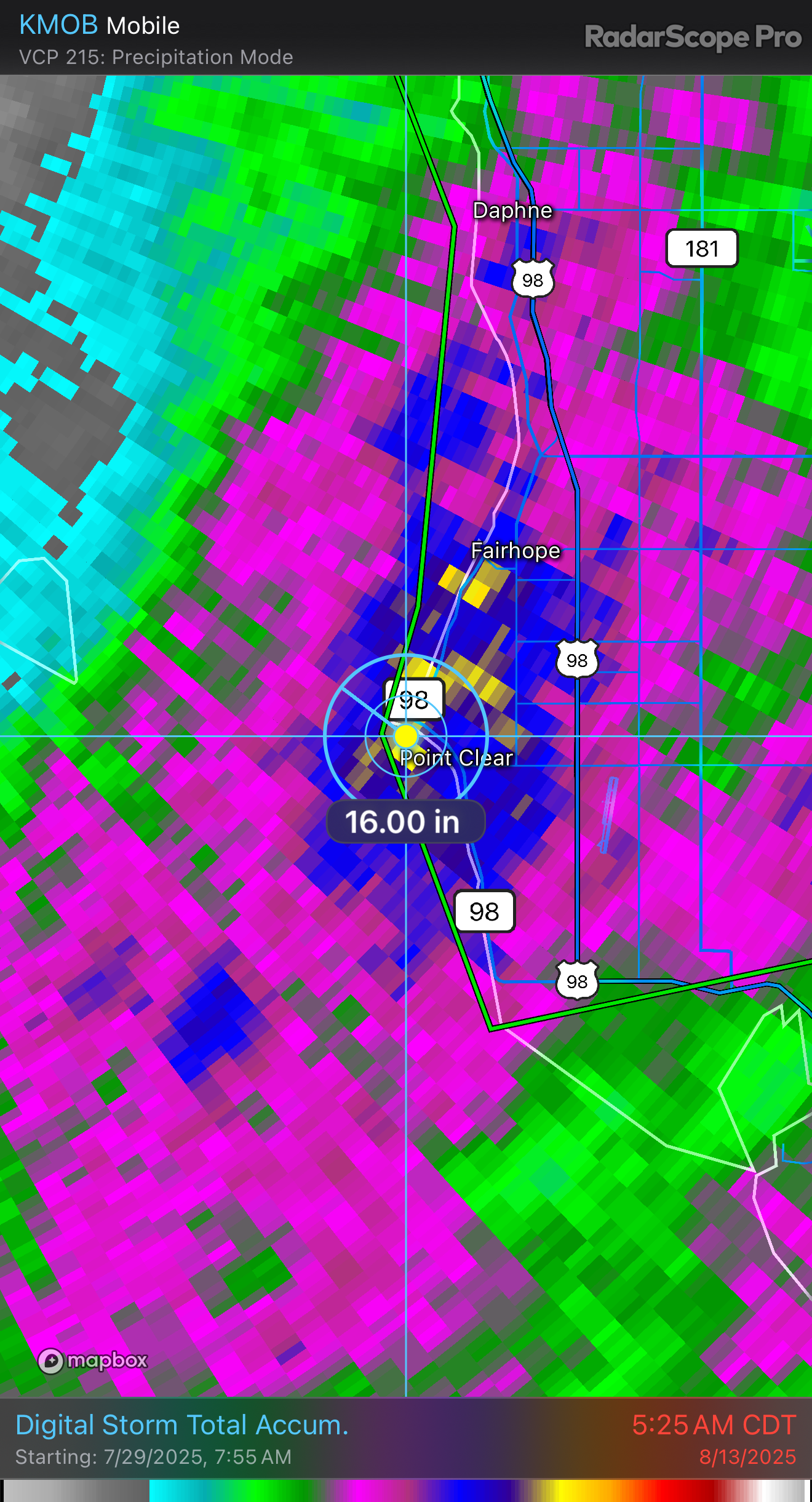 RADAR CHECK: Torrential rain has been falling this morning across parts of Mobile and Baldwin counties thanks to a small scale low that moved in from the Gulf. Radar estimates suggest 16 inches of rain at Point Clear since it started. This is probably overdone, but amounts of 8-10 inches of rain are certain along parts of the eastern shore. Flooding is likely serious in spots from Spanish Fort down to Point Clear.