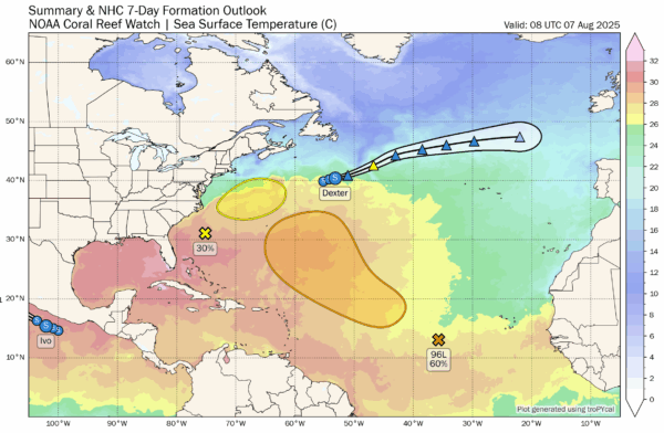 *Tropical Storm Dexter, in the open Atlantic well east of the U.S. … becomes post tropical today as it moves into a colder environment.