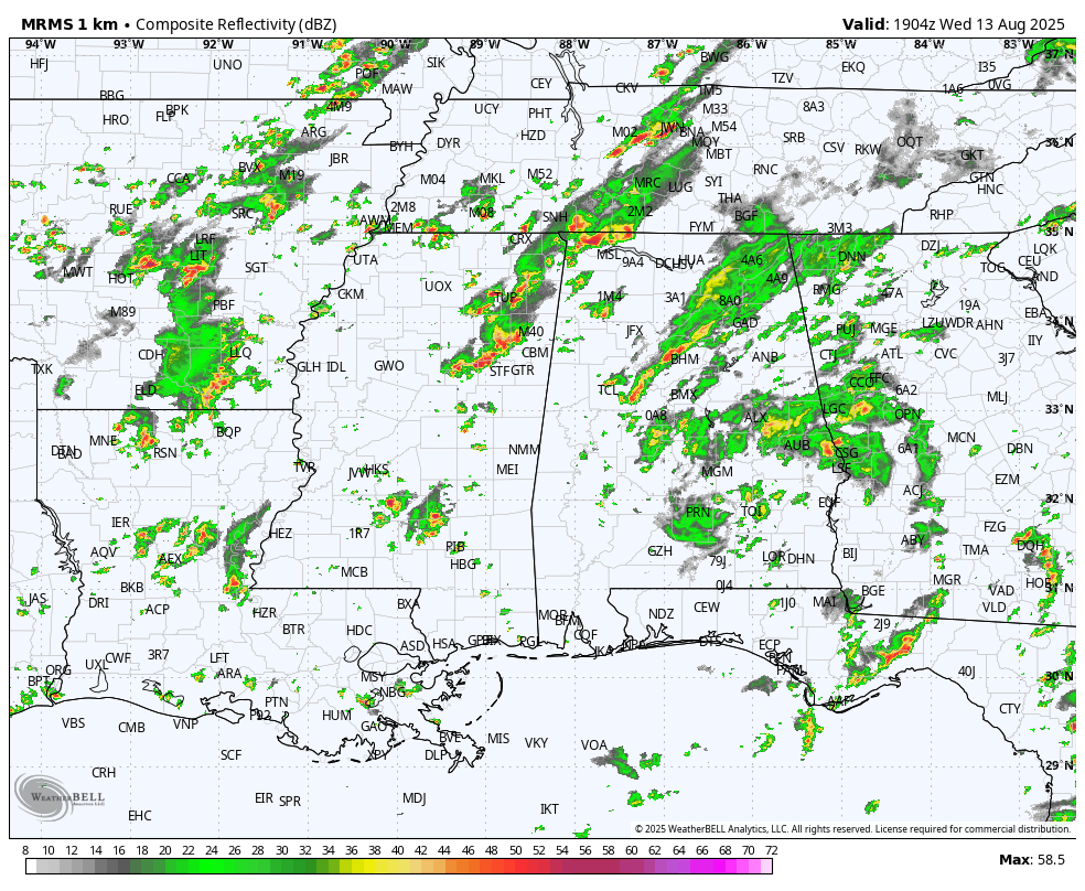 RADAR CHECK: We have scattered to numerous showers and thunderstorms across Alabama this afternoon in a tropical airmass that covers the state. Stronger storms are producing torrential rain and frequent lightning. Temperatures remain below average with most communities in the 75-85 degree range; where the sun is out we have upper 80s.