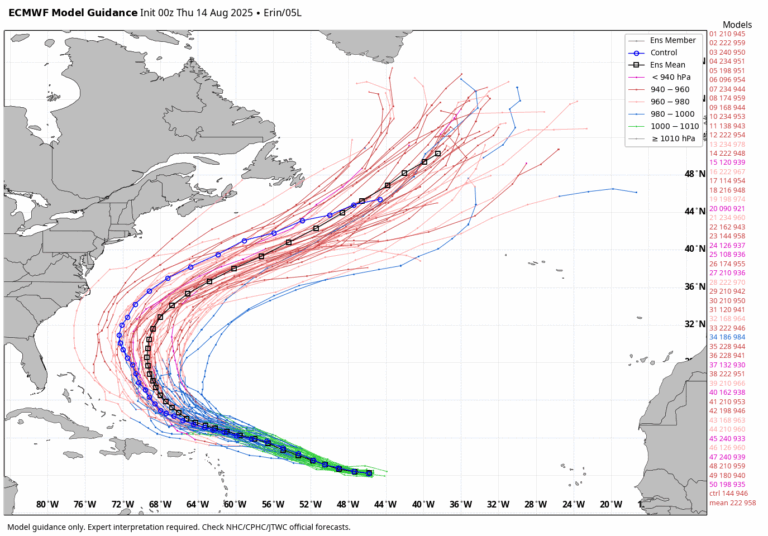 TROPICS: Tropical Storm Erin, with 50 mph winds, is in the middle of the Atlantic moving to the at 17 mph. The system is expected to become a hurricane late tonight or tomorrow. It will pass north of the Leeward Islands and Puerto, and then it turns north, east of the Bahamas, this weekend. By that time Erin is expected to become a major hurricane with winds of 125 mph (category three strength). Erin is expected to remain well east of the U.S. East Coast, but it could be closer to Bermuda by the middle of next week.
