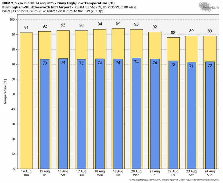 THE ALABAMA WEEKEND: As the upper ridge continues to build, afternoon highs will be in the low- to mid-90s over the weekend with only isolated afternoon showers or storms. Many communities will be rain-free over the weekend.