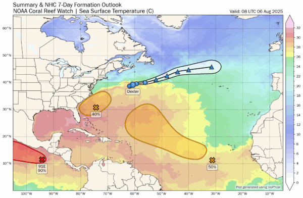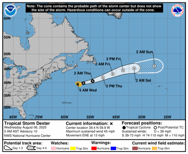 *Tropical Storm Dexter, with winds of only 45 mph, is well northeast of Bermuda in the open Atlantic and is moving east/northeast. It becomes post-tropical tomorrow far from land.
