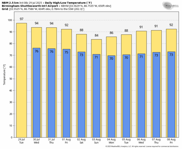 NEXT WEEK: Many north Alabama communities will continue to see highs in the upper 80s Monday and Tuesday (low 90s for south Alabama); then highs will be between 90 and 93 degrees statewide over the latter half of the week. Each day will have the usual chance of scattered, mostly afternoon and evening showers and thunderstorms.