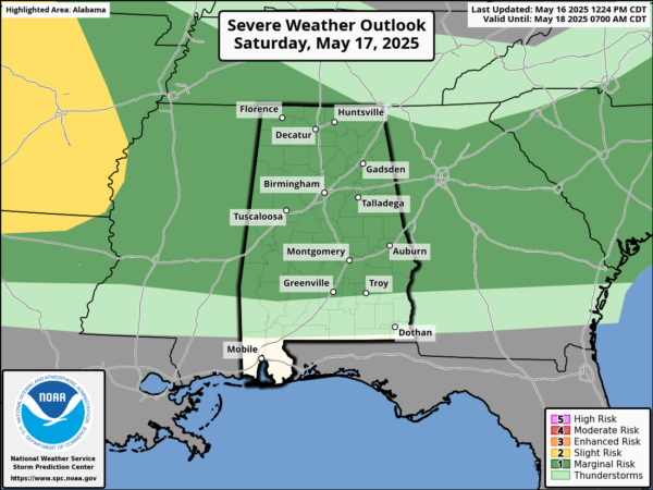 WARM MAY DAY: Alabama’s weather is dry this afternoon with temperatures in the 80s. Clouds will thicken tonight, and a band of strong storms ahead of a surface front will move into far north Alabama around midnight. The storms will be capable of producing strong, gusty winds and possibly some small hail; the tornado threat for Alabama is very low.