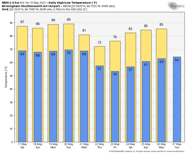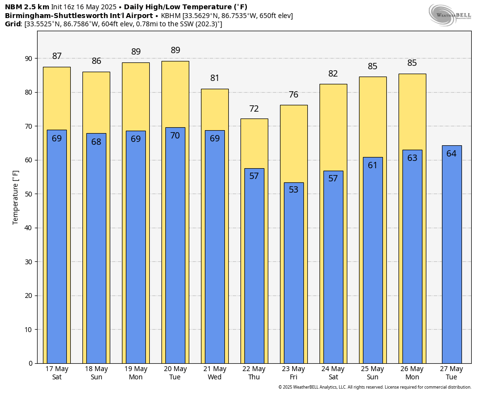 NEXT WEEK: Most of Alabama will be very warm and dry Monday and during the day Tuesday. We will forecast a good chance of showers and thunderstorms Tuesday night into Wednesday morning; a few strong storms are possible, but for now it looks like the highest threat of severe storms will be north and west of Alabama with this system. Much cooler air invades the Deep South later in the week; cooler spots over north Alabama could reach the 40s by Friday morning. For now, the Memorial Day weekend looks dry with warm days and pleasant nights.