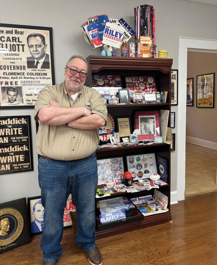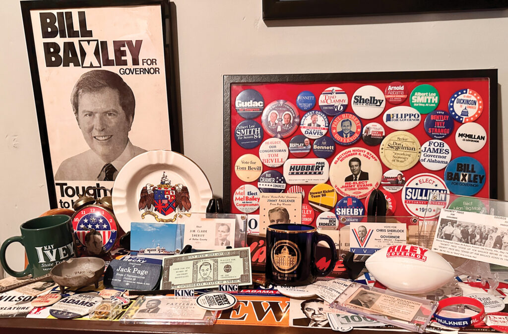 His collection, he says, “is believed to be the largest private collection of Alabama campaign memorabilia around.” It’s so large now that he doesn’t even buy items like he used to. “People just give me stuff,” he says. “They’ll leave a box on my front porch.