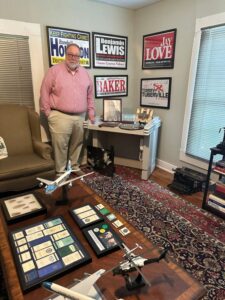 Azbell – for more than 30 years a political adviser to dozens of Alabama politicians and campaigns, speechwriter for governors and communications adviser for the House Republican Caucus – has been adding to that original set of political buttons for more than four decades. His collection of memorabilia got so large that it outgrew the man cave at his house, and five years ago he moved it to his office in downtown Montgomery. Last fall he moved it again to a larger space, a 1910-era house just a few blocks from the State Capitol.