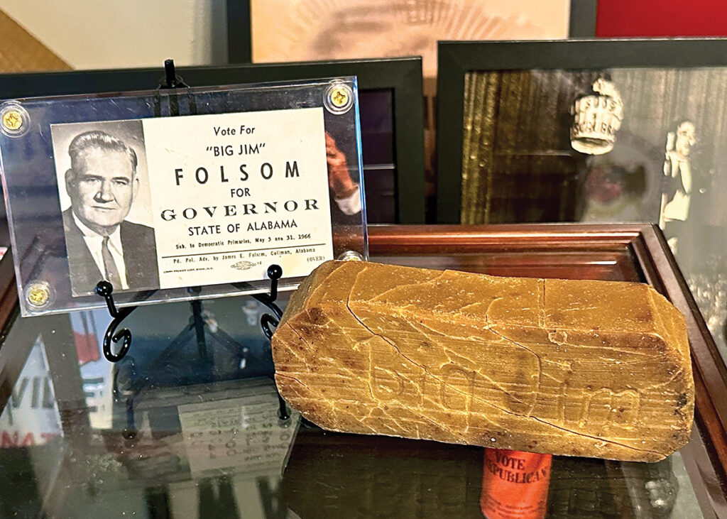 Alabamians of a certain age might remember when former Gov. “Big Jim” Folsom campaigned with a corn shuck mop and suds bucket, promising to clean up corruption. “If you were a woman and you attended a Folsom rally in 1946, you got a bar of soap with Big Jim’s name on it,” he says, displaying the brown bar of lye soap he got about 25 years ago. The Republican Party in 1996 distributed mini-cans of scouring powder while pledging to “clean up politics.” A matchbook seeking support to draft Wallace for governor from the 1960s also included, on the back, information to apply for membership in the Ku Klux Klan.