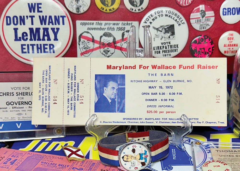 Among the thousands of pieces of memorabilia housed in Azbell’s collection, one is his favorite. “It’s a ticket to a George Wallace fundraiser on May 15, 1972,” he says, holding the ticket, which is preserved in a protective covering. “That was the date of the shooting in Laurel, Maryland. This ticket was (to) the next event on his schedule. It was unused because it was canceled. I don’t know of another ticket to this event that exists today.”