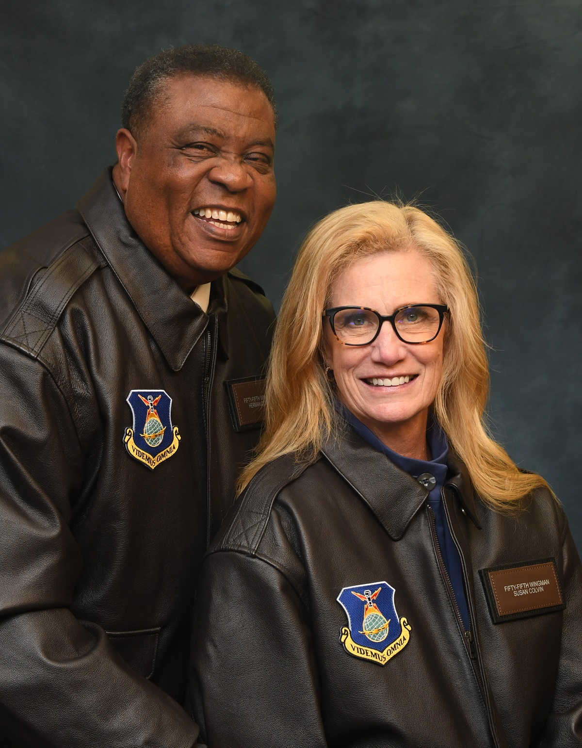 Herman Colvin and his wife, Susan, pose for a studio photo inside the 55th Wing headquarters building at Offutt Air Force Base, Nebraska. (U.S. Air Force photo by Charles J. Haymond)