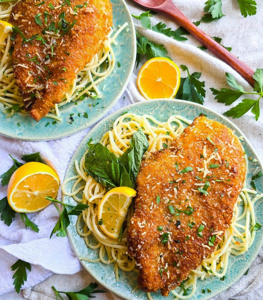 Crispy Parmesan Crusted Chicken Pasta with Lemon Butter Basil Sauce