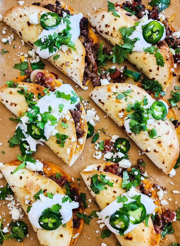 - Fold the other side over and bake the tacos for 12-15 minutes, and broil on high for 2-3 minutes until the cheese is melted and the tortillas are golden brown.