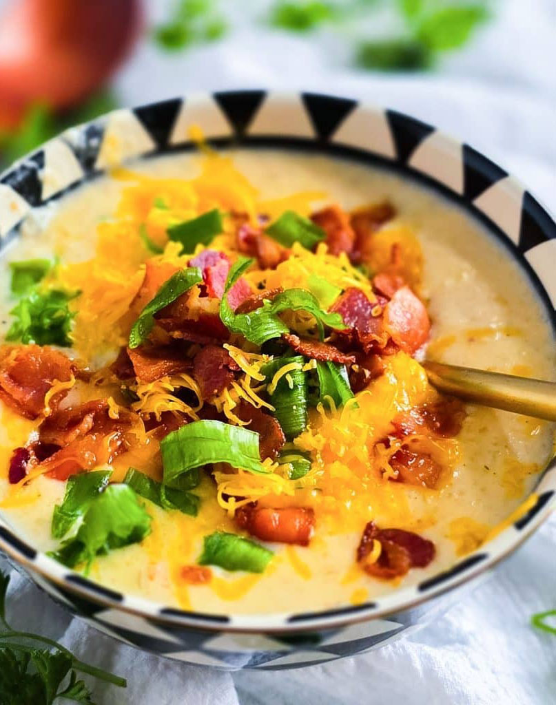 - Ladle into bowls and top with the reserved bacon, shredded cheddar cheese and diced green onions.