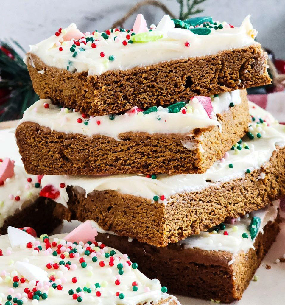 Frost and decorate: Once cooled, spread the cream cheese frosting evenly over the gingerbread cookie bars and finish by generously sprinkling festive holiday sprinkles.