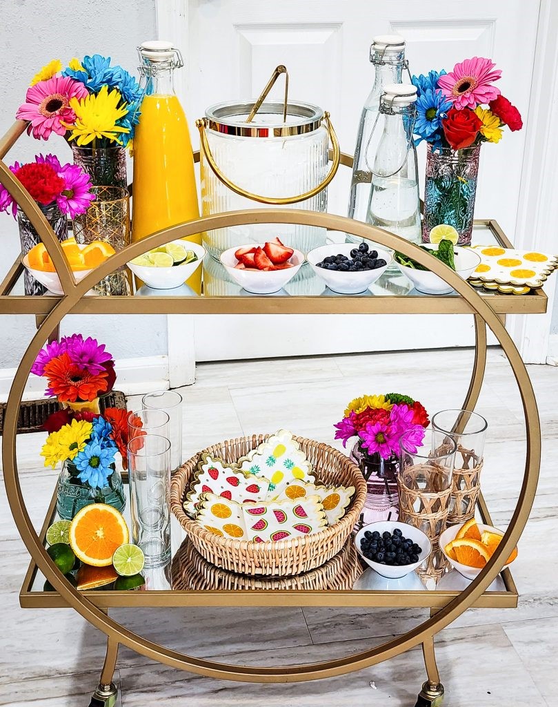 Use your mason jars and glasses as vases. Fill them with water and add a mix of colorful flowers. Place them strategically around the cart to create a vibrant and inviting atmosphere. Fold the fruit-themed napkins and stack them neatly or place them in a small basket. Fill an ice bucket with ice and keep it within easy reach to chill the drinks.