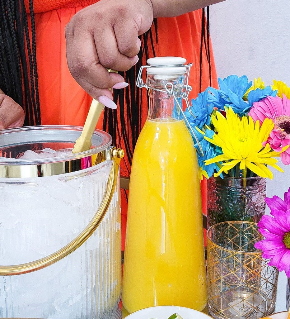 Pour the orange juice into a large, easy-to-pour pitcher. If you have multiple juices, arrange them in similar pitchers to create a cohesive look. Stock a few bottles or cans of sparkling water. Consider flavored sparkling water for an extra twist.