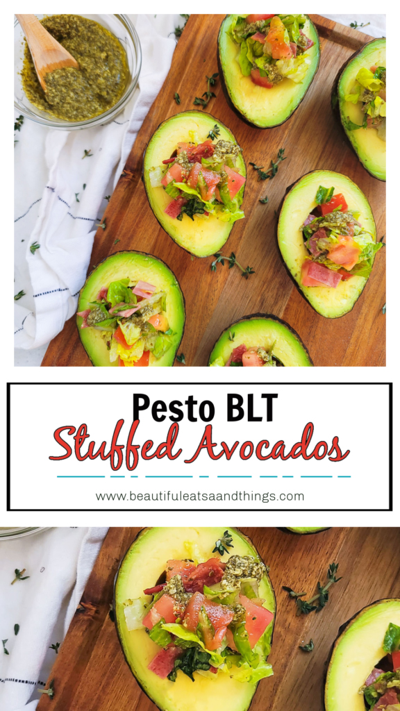 Because I am a huge fan of avocados and foods that leaving me feeling satisfied, one of my favorite snacks includes these tasty Pesto BLT Stuffed Avocados. We usually keep several fresh avocados on hand because they are extremely versatile and a great addition to any meal or snack.