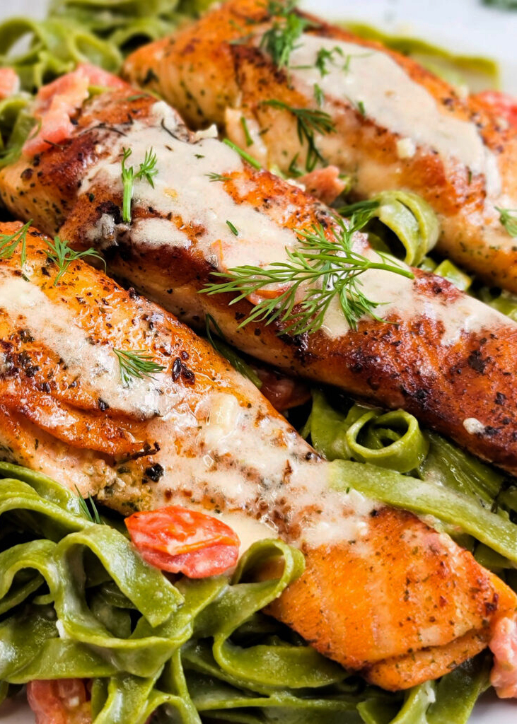 Salmon Spinach Fettuccini with Creamy Feta & Garlic Sauce