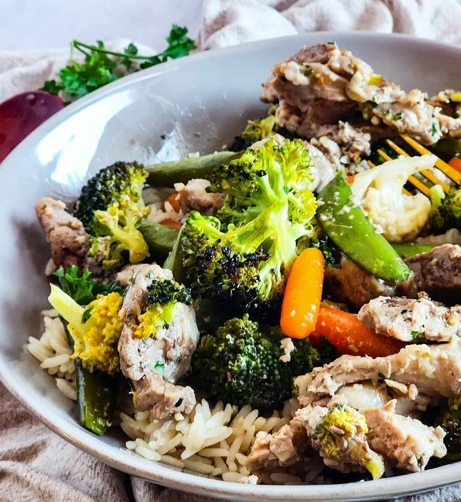 One of my go-to favorites is Sheet Pan Honey Garlic Pork Loin & Vegetables. This dish is packed with lean protein, fiber-rich veggies and a deliciously sweet and savory honey garlic sauce that brings it all together.