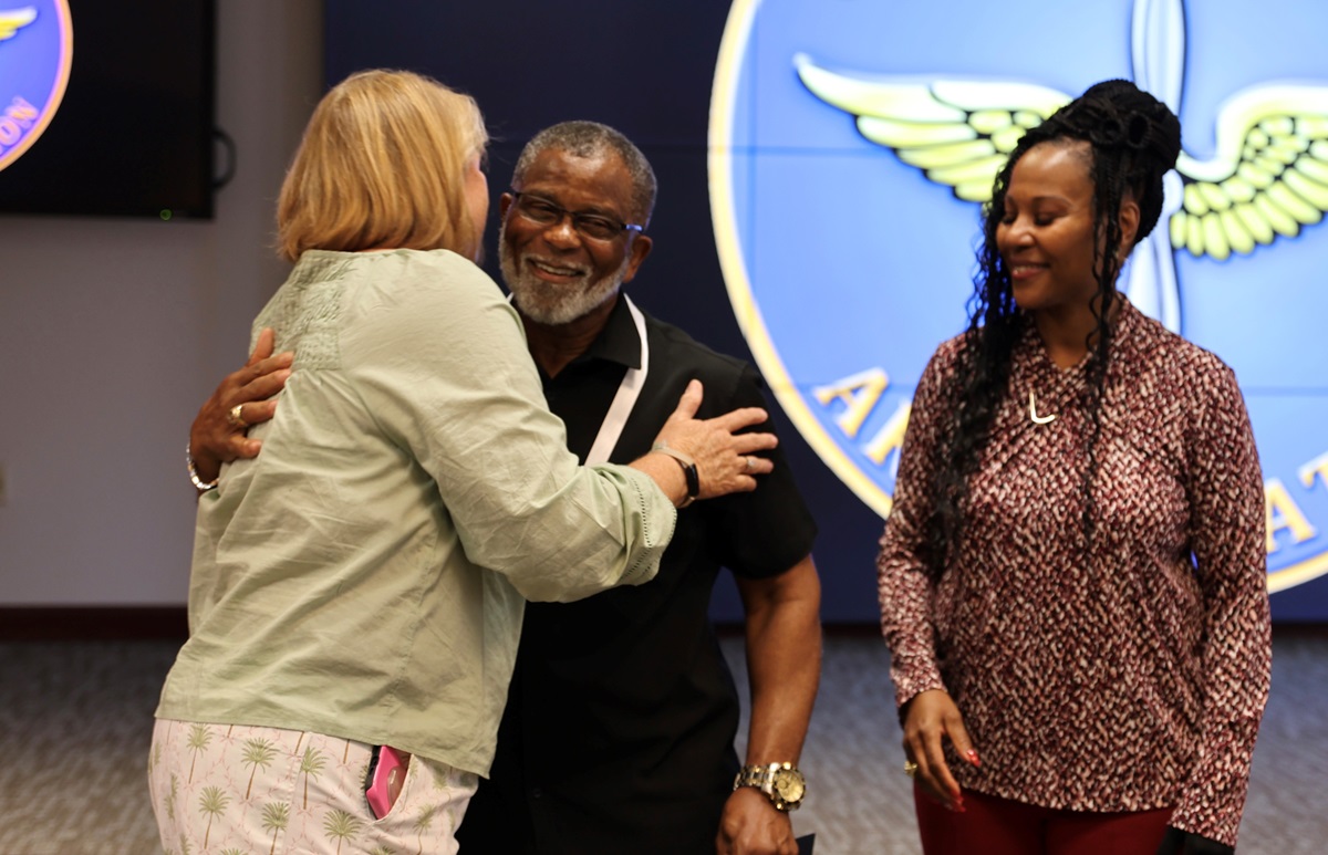 Friends congratulate CSM (R) Otis Smith and his spouse on his 50 years of federal service at a ceremony to honor him at Fort Rucker, Alabama on July 2. (Leslie Herlick / U.S. Army Aviation Center of Excellence)