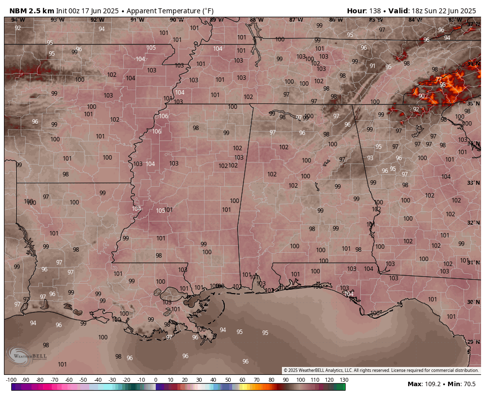 Saturday brings the heat in full force. That ridge over the East Coast strengthens, keeping most storm chances confined to the far southern part of the state. For the rest of central and north Alabama, expect lots of sun, hazy skies and high humidity. The heat index will likely push the 100-degree mark. Afternoon highs will rise into the low to mid 90s.