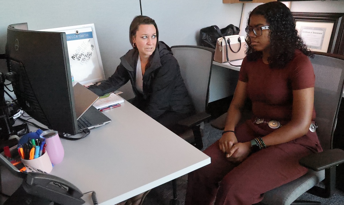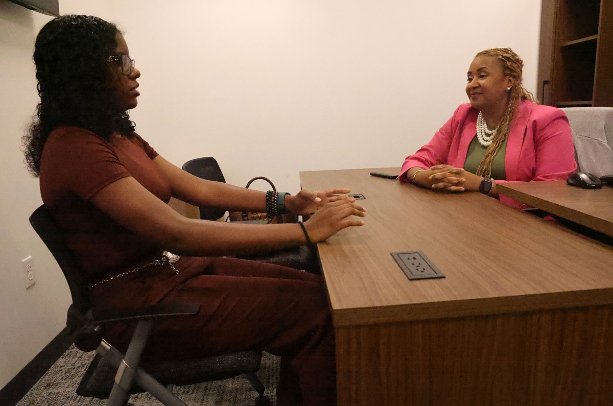 Amber Houston, U.S. Army Corps of Engineers, Mobile District, supervisory civil engineer, speaks with Jaycee Henderson, rising senior at Davidson High School, about what it is like to be a woman in the engineering career field and at USACE during a shadow day at the Mobile District Office. Henderson received the opportunity to shadow District engineers for the day to learn more about engineering and USACE as a possible career path. (U.S. Army photo by Chuck Walker)